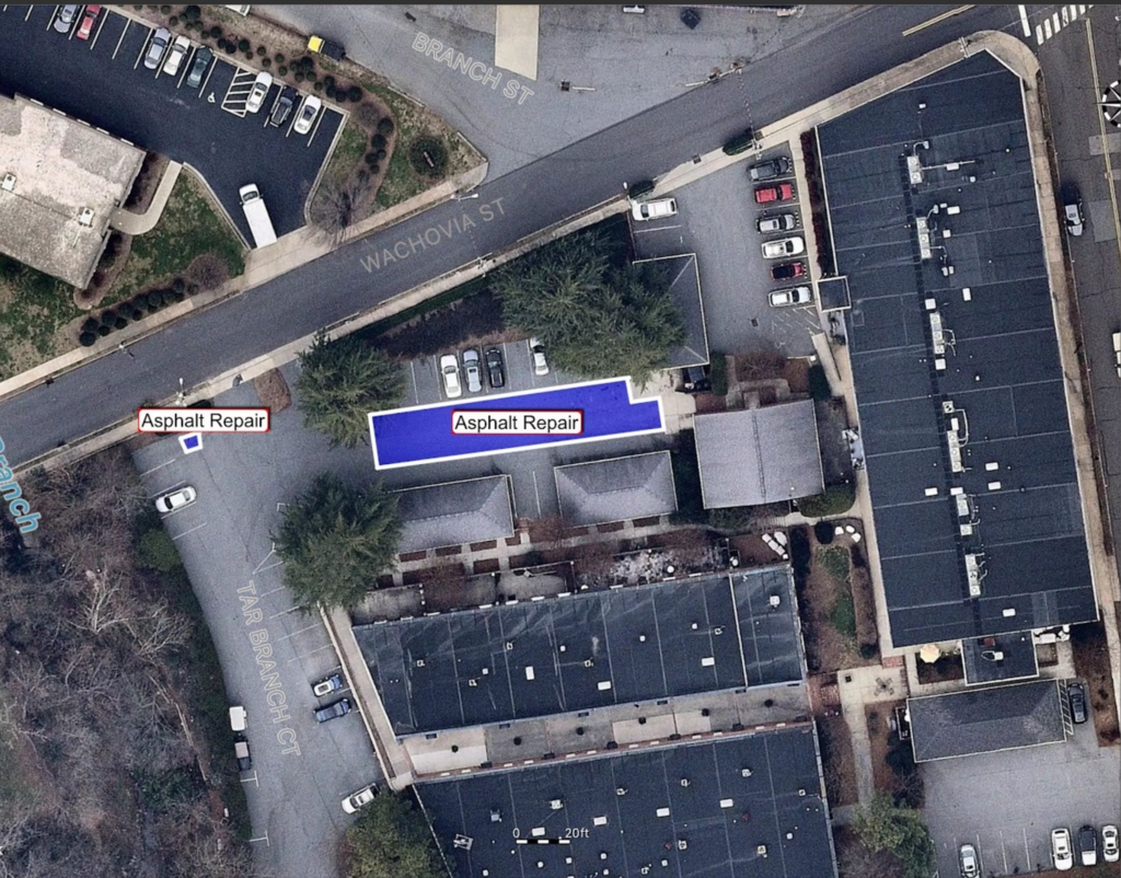 The Board has approved an excavation and repair project for asphalt in the Lower Wachovia Parking Lot. The area of concern runs west-to-east from the street ramp to the dumpster enclosure, parallel to the striped parking spaces on the north and the two garage structures on the south.